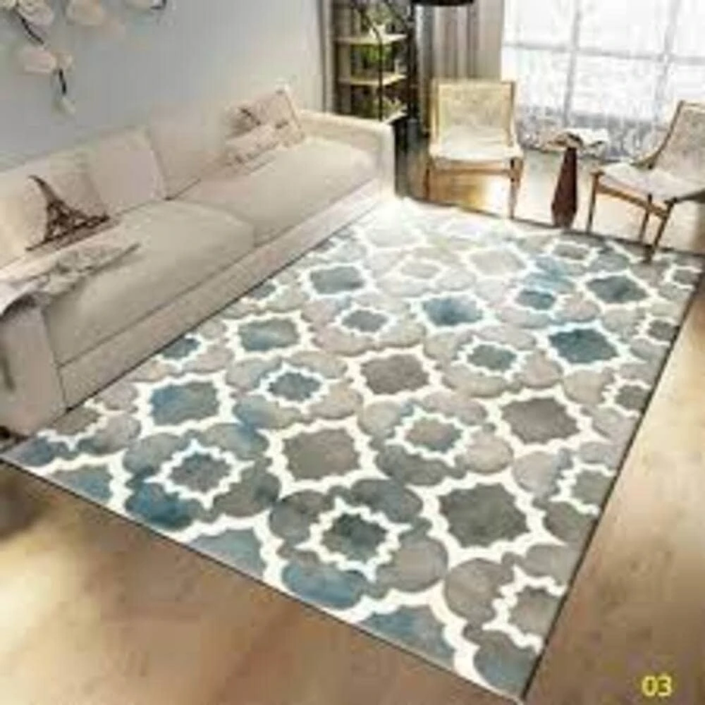 C’est un tapis d’intérieur / salon de teinte bleue (ton moyen à foncé), avec un motif de libellules (dragonflies) en blanc / clair qui semblent “voler” sur le fond.